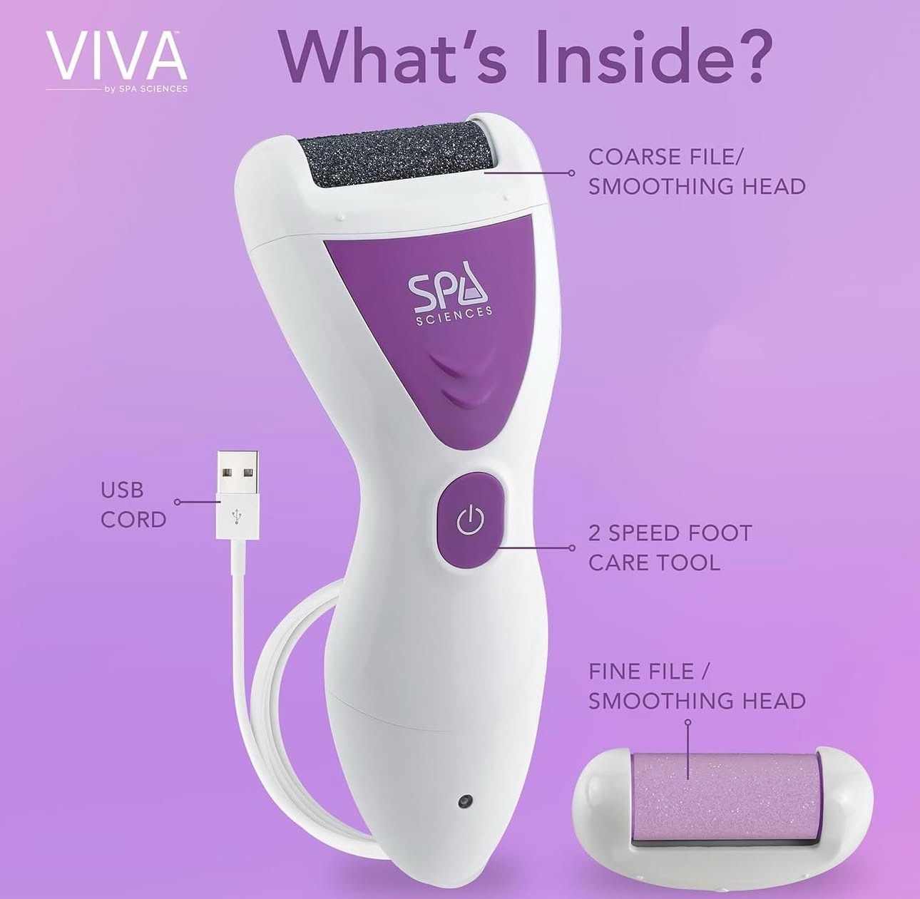 أداة باديكير Viva الأقوى المتوفرة من Spa Sciences – أداة باديكير إلكترونية احترافية لتنعيم القدمين لإزالة الجلد القاسي والجاف والمتشقق/الكالو على القدمين، قابلة لإعادة الشحن – رأسان للعلاج متضمنان