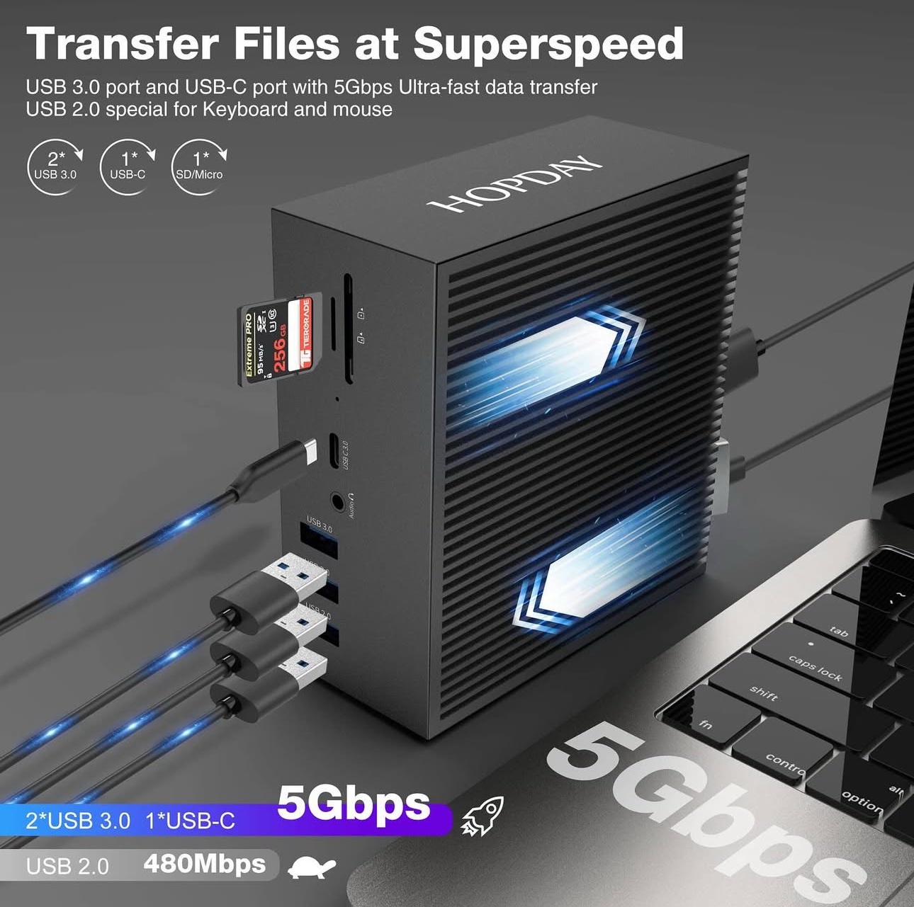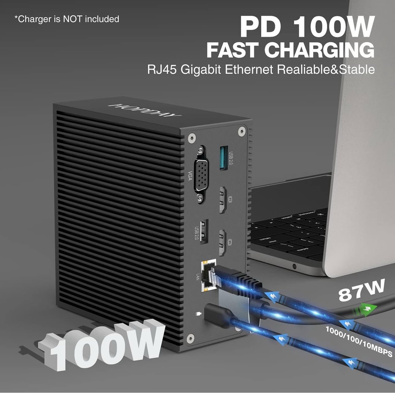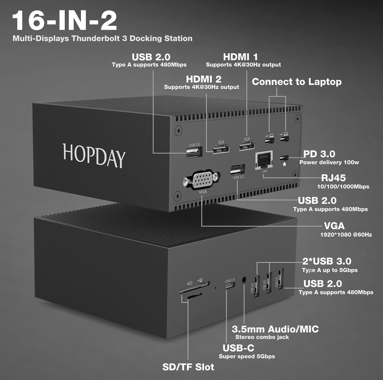 حوّل جهاز MacBook Pro/Air الخاص بك إلى محطة عمل متكاملة مع قاعدة توصيل USB-C HOPDAY 16 في 2 – دعم ثلاثي الشاشة 4K، شحن PD 100 واط، منافذ HDMI/VGA/USB/SD/Ethernet لنقل بيانات سريع ومتعدد الاستخدامات