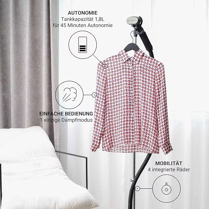 يعمل الجهاز بقدرة قصوى 1800 واط مع تدفق بخار مستمر 40 غرام في الدقيقة، جاهز للاستخدام خلال 60 ثانية، ويوفر تنعيمًا فعالًا للملابس دون الحاجة إلى لوح كي.