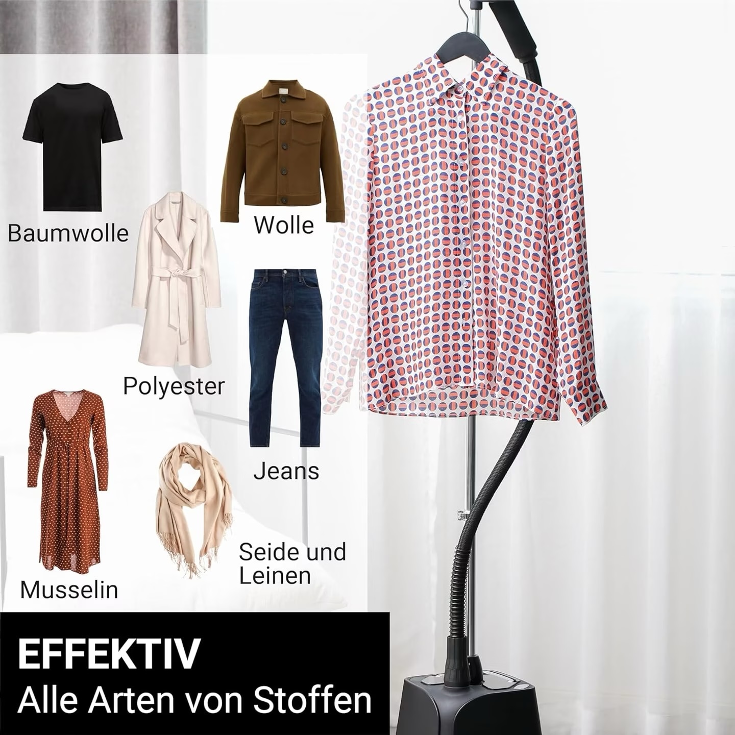 الجهاز مناسب للملابس اليومية، البدلات، العبايات، الستائر، وأغطية الأسرّة، كما يمكن استخدامه لإنعاش الأقمشة وتعقيمها بالبخار، مما يجعله خيارًا عمليًا للمنزل