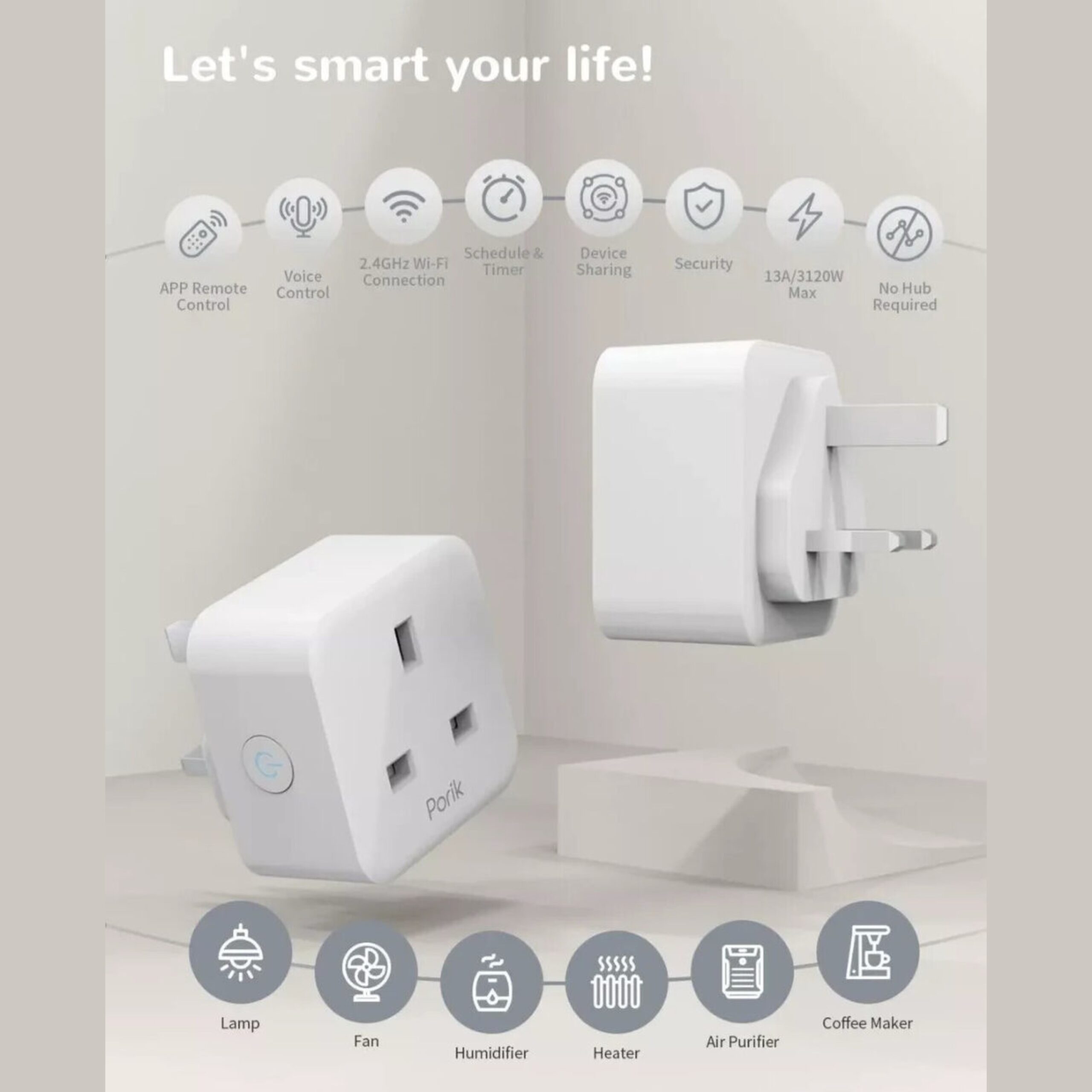 عبوة PORIK من مقبسين ذكيين تعمل بتقنية واي فاي، تحكم صوتي عبر أليكسا وجوجل هوم، جدولة ومؤقت، تحكم عن بُعد عبر التطبيق، تصميم آمن يتحمل حتى 13 أمبير، مثالية للمنزل الذكي.