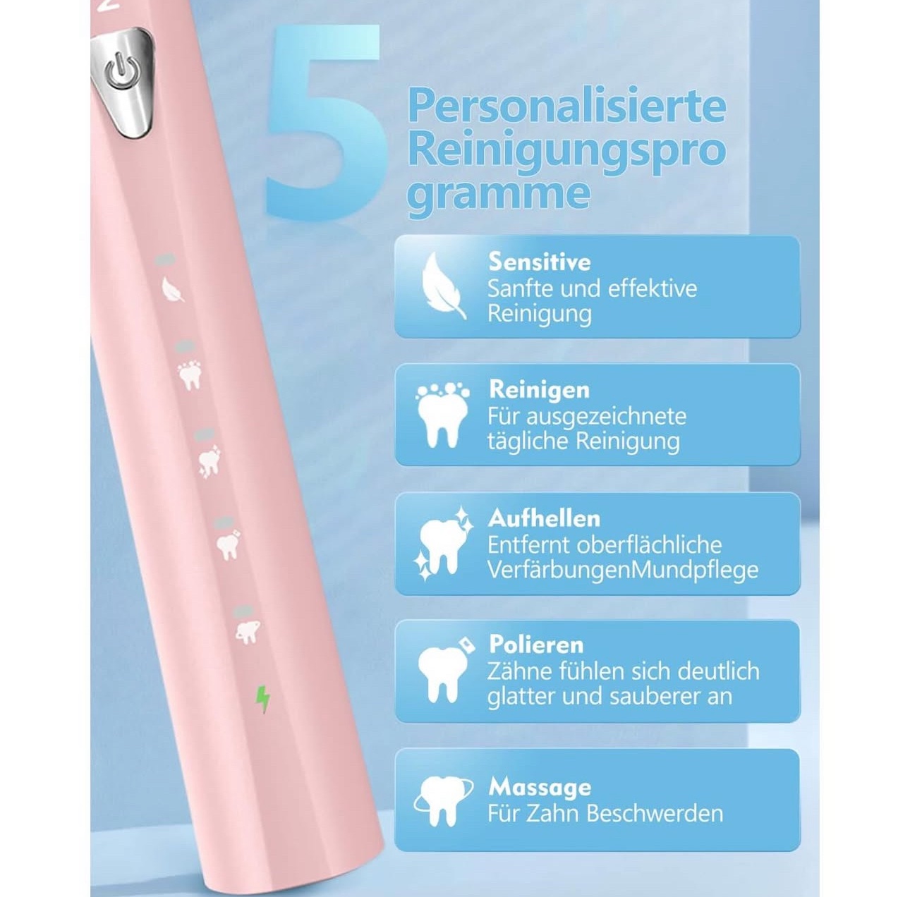 خمسة أوضاع تنظيف: تنظيف – تبييض – أسنان حساسة – تلميع – تدليك.