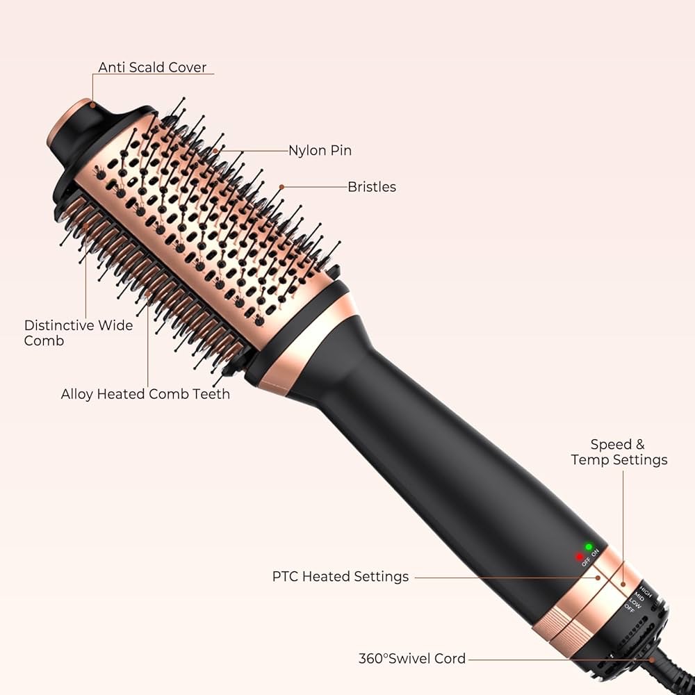 فرشاة وان ستيب الأصلية 1000 واط تجمع التجفيف والفرد والتكثيف في جهاز واحد، بثلاث درجات حرارة وتقنية أيونية تقلل النفشة وتحافظ على رطوبة الشعر. سلك دوار 360° وقابس أمان ALCI لجودة وأمان عاليين لجميع أنواع الشعر.