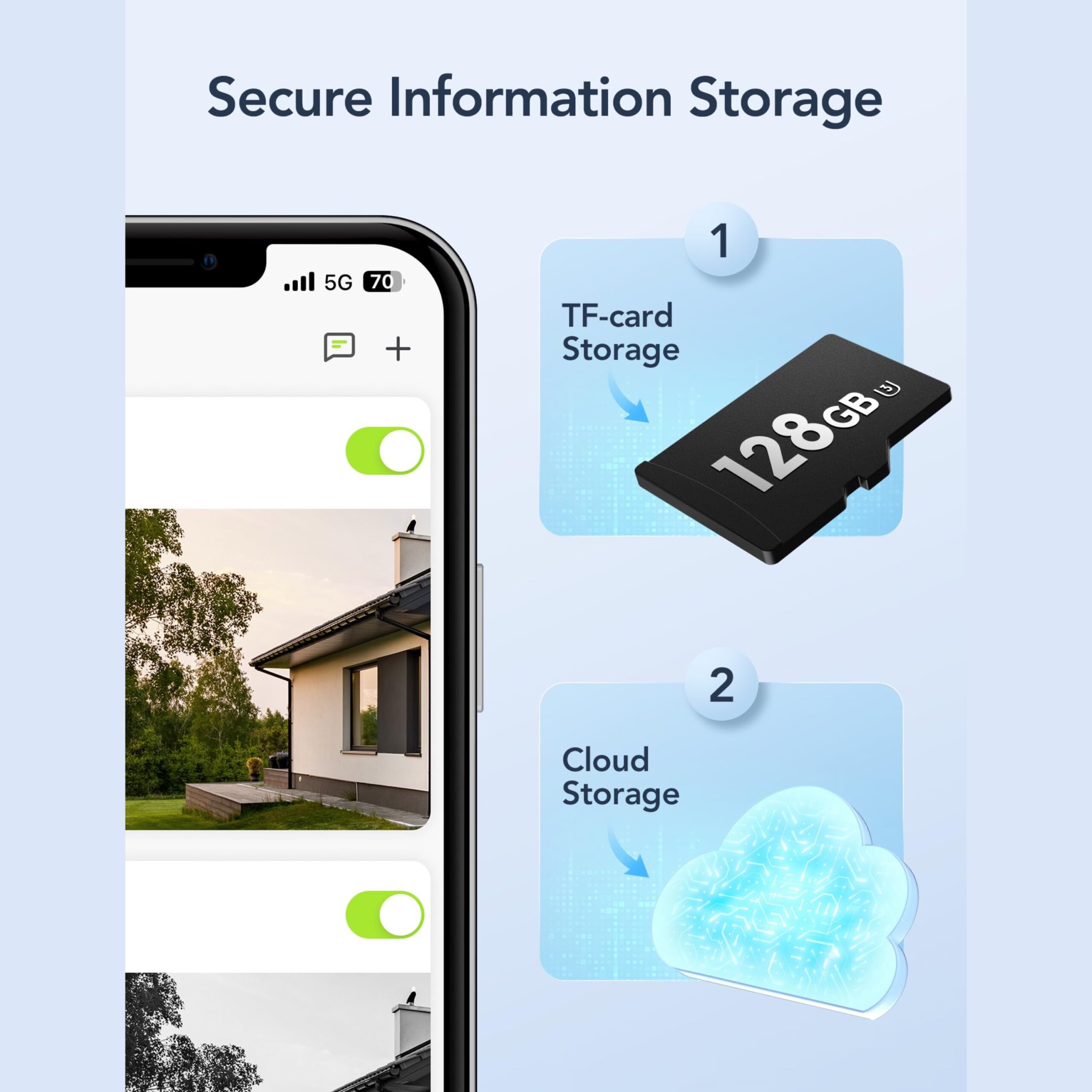 توفر الكاميرا خيارات تخزين مرنة، تشمل بطاقة Micro SD حتى 128 جيجابايت غير مرفقة، أو تخزين سحابي مشفر باشتراك، لضمان حفظ المقاطع المهمة وإمكانية الرجوع إليها في أي وقت.