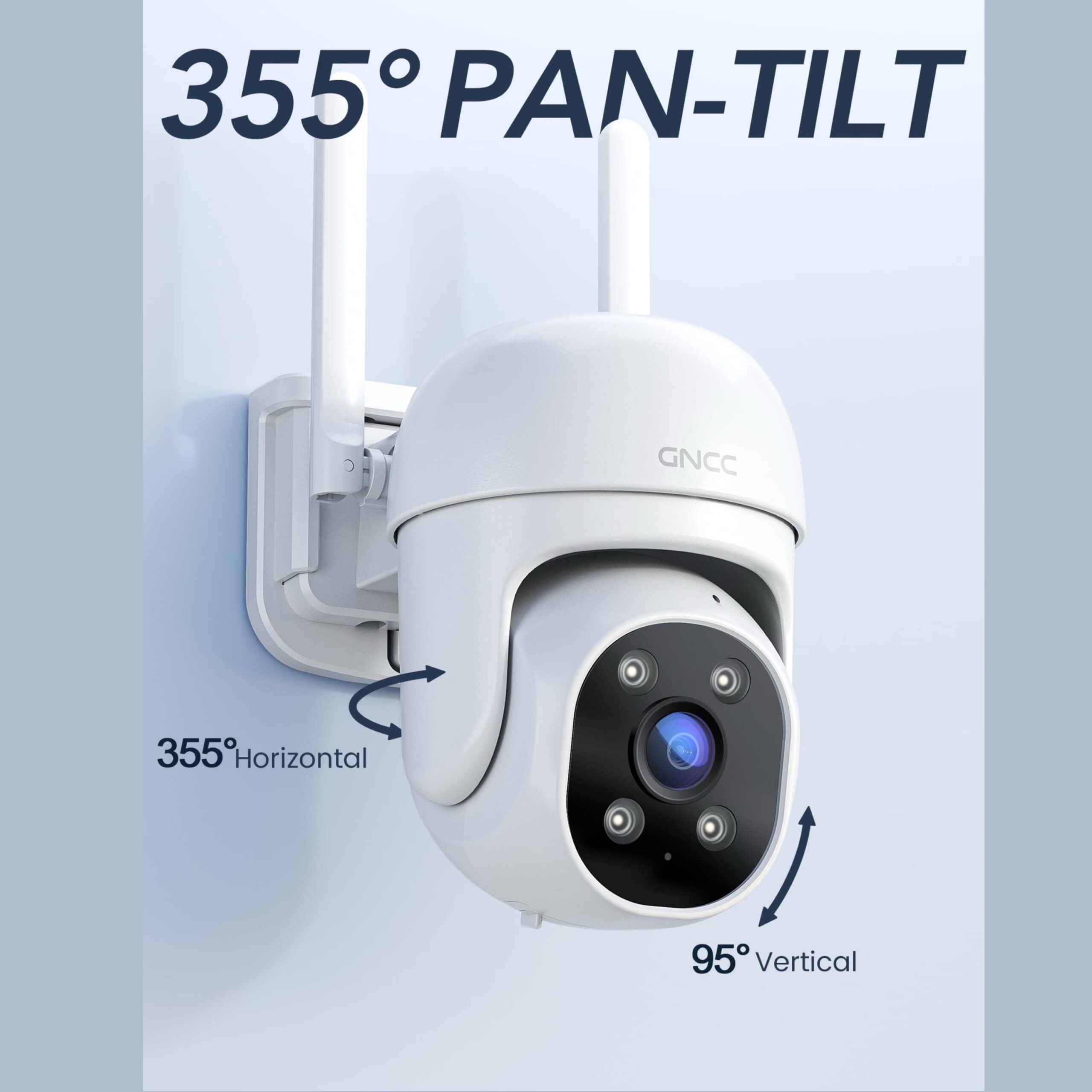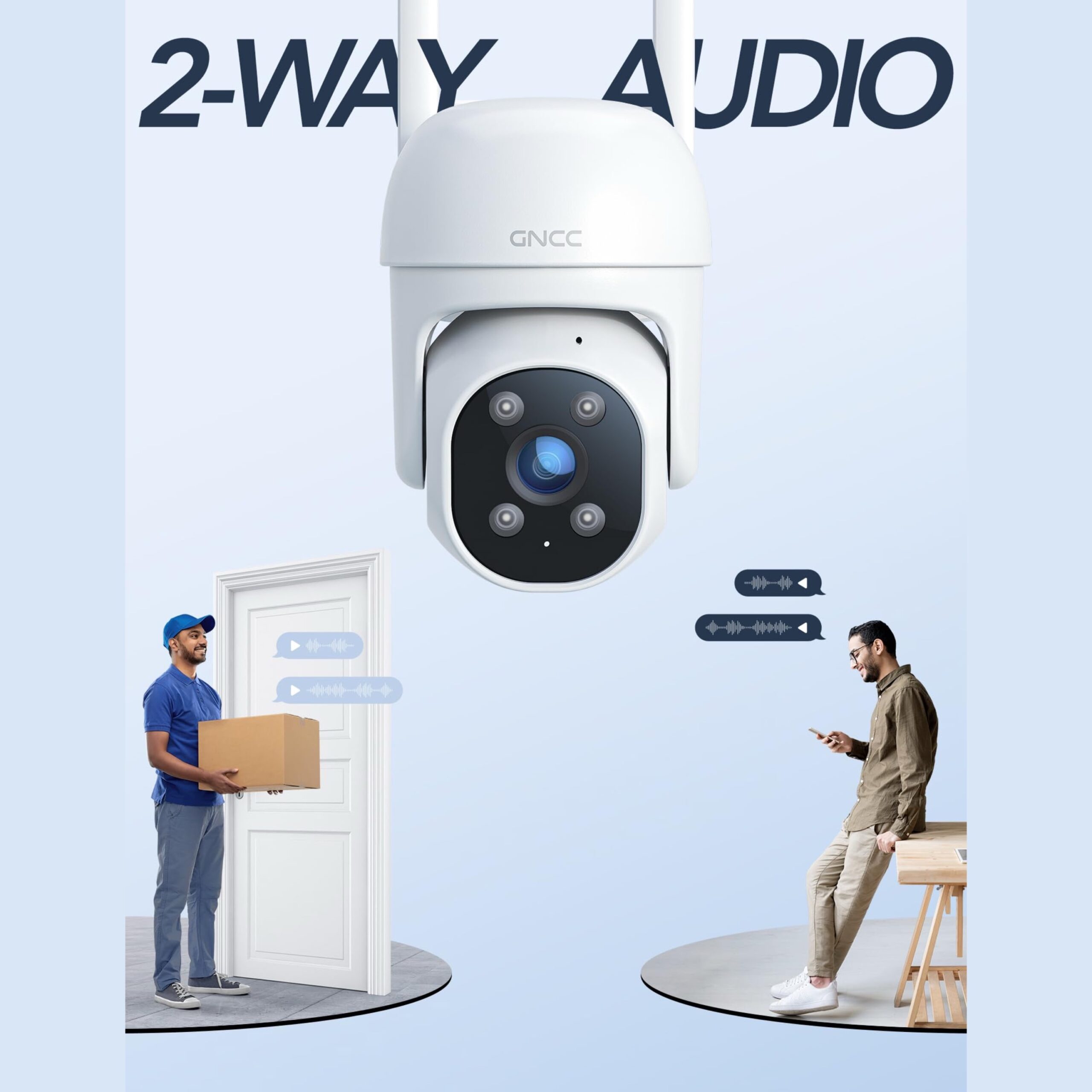 كاميرا مراقبة GNCC GK2 الخارجية بدقة 1080P، دوران PTZ واسع، رؤية ليلية ملونة، كشف حركة بالذكاء الاصطناعي، صوت ثنائي الاتجاه، مقاومة للماء IP65، تعمل سلكيًا 24 ساعة، تدعم Alexa والتخزين السحابي وSD.