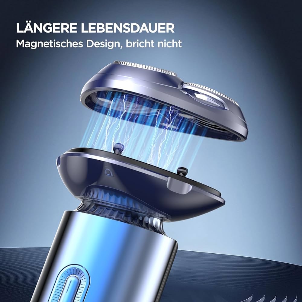 ماكينة حلاقة كهربائية ثلاثية الأبعاد بقدرة عالية، توفر حلاقة دقيقة بفضل الرأس المغناطيسي العائم والتصميم المزدوج الطبقات. مقاومة للماء IPX7، تعمل جافة ورطبة، وتأتي بقفل سفر وشاشة LED للاستخدام اليومي.