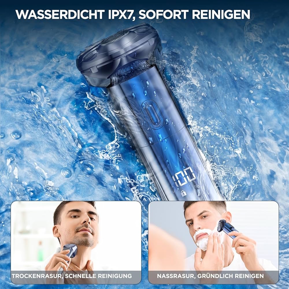 مقاومة للماء بدرجة IPX7 وقابلة للغسل بالكامل، ما يسمح بحلاقة جافة أو رطبة حسب الرغبة وتنظيف سريع تحت الماء.