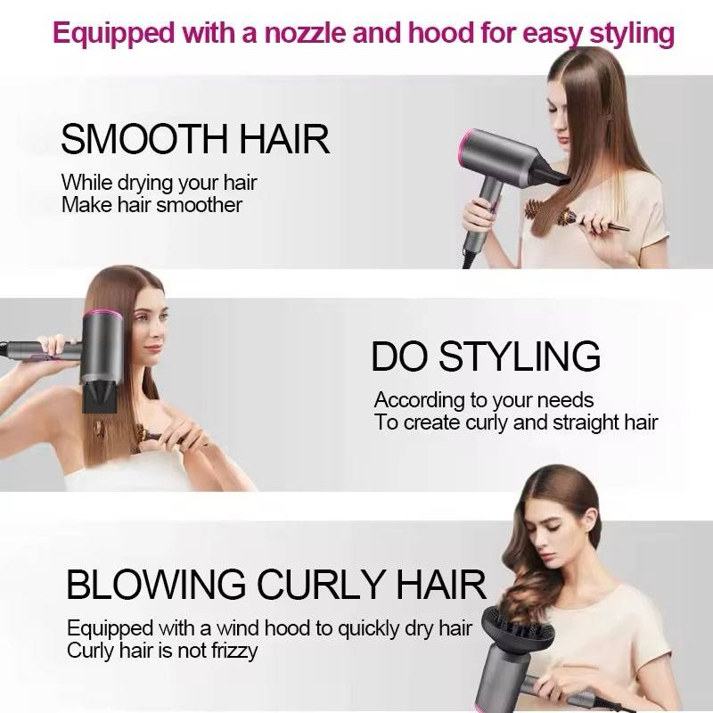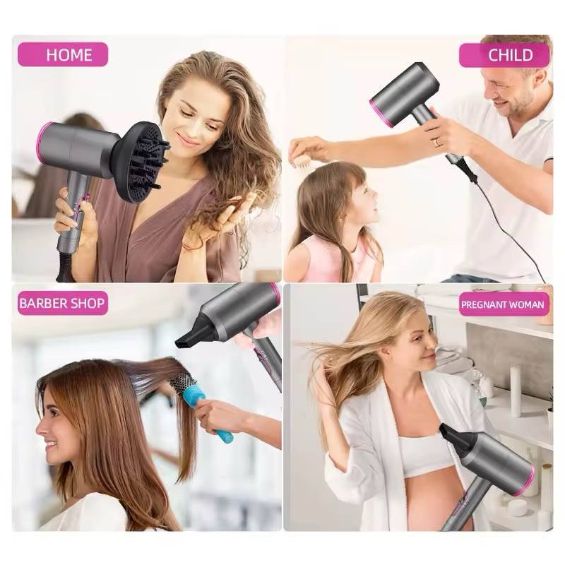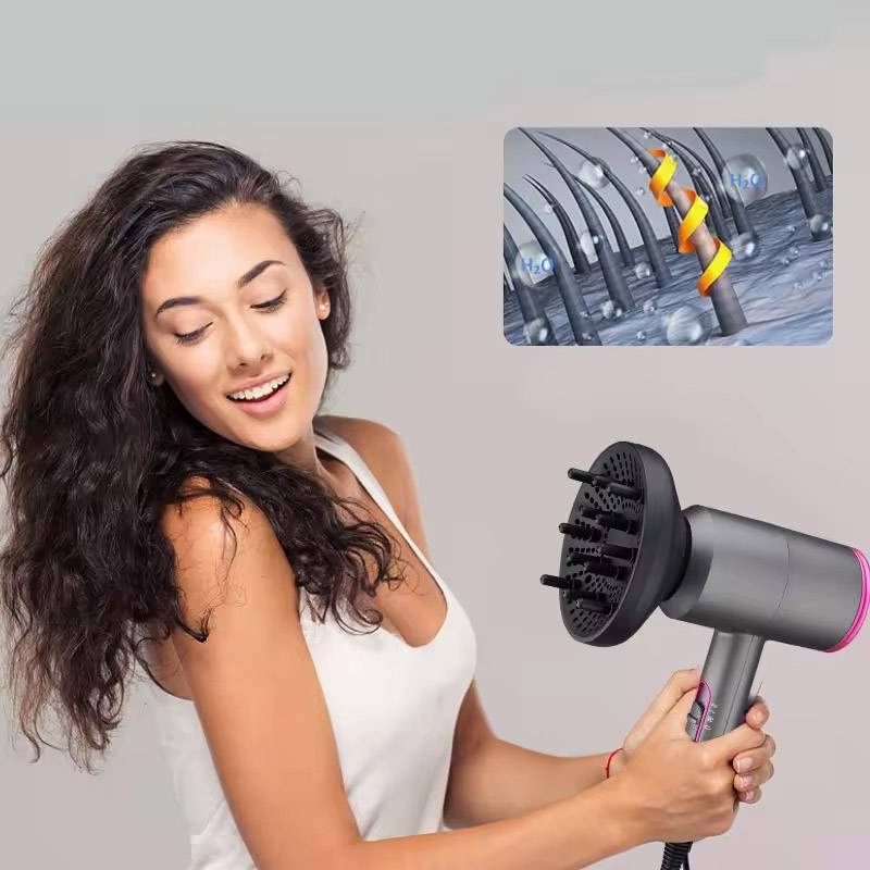 مجفف شعر قوي 2000 واط بتقنية أيونية 200 مليون أيون لتقليل التطاير وتنعيم الشعر. مزود بثلاثة إعدادات حرارة وهواء بارد، محرك سريع، وملحقات احترافية للتنعيم والتجعيد. حماية حرارية ذاتية ويصلح للمنزل، الصالون، والسفر.