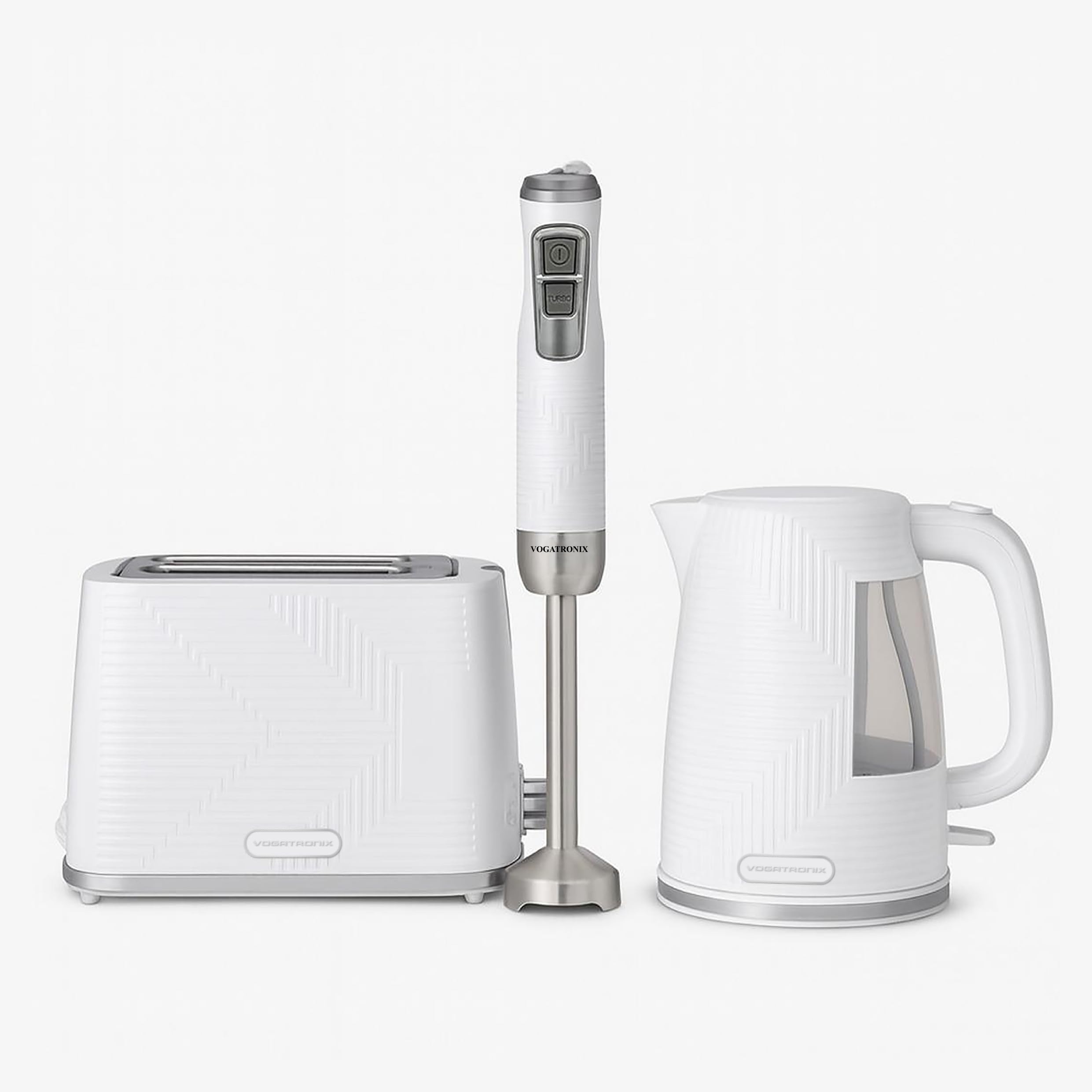 مجموعة إفطار بيضاء 3 في 1 تضم غلاية 1.7 لتر بإضاءة LED، محمصة شريحتين بثلاث وظائف، وخلاط يدوي 500 واط بعمود ستانلس، تصميم عصري موفر للطاقة مثالي للمطابخ الحديثة.