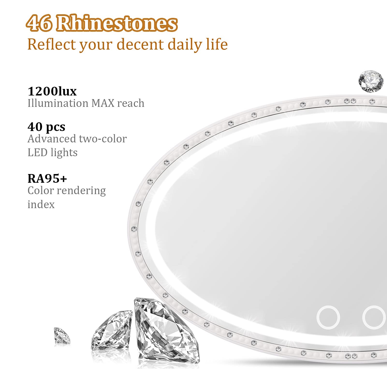 تحتوي المرآة على 40 مصباح LED بقوة سطوع تصل إلى 1200 لوكس، توفر إضاءة مكياج واضحة وفعالة، مع استهلاك منخفض للطاقة مقارنة بالمصابيح التقليدية.