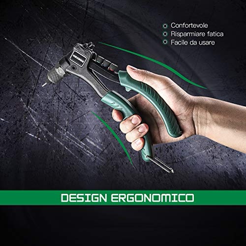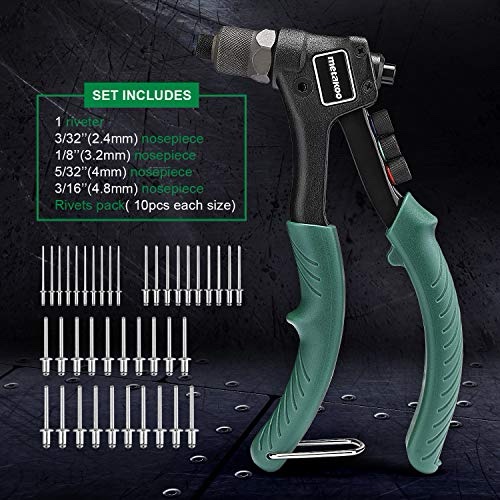 تحتوي العبوة على مسدس تونك و40 قطعة برشام ألومنيوم مقسمة إلى أربعة أحجام، عشر قطع لكل حجم، مما يوفر مجموعة كاملة وجاهزة للعمل دون الحاجة لشراء إضافات