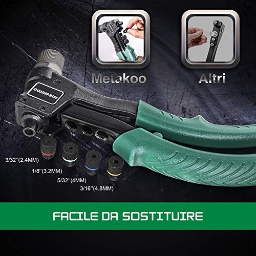 مسدس تونك METAKOO احترافي بأربعة رؤوس قابلة للتبديل، مصنوع من سبائك الألومنيوم والفولاذ المقوى، يمنح تثبيتاً قوياً وسهلاً. مناسب للألمنيوم والفولاذ والستانلس، مع 40 قطعة تونك مخزّنة عملياً داخل المقبض للاستخدام السريع.