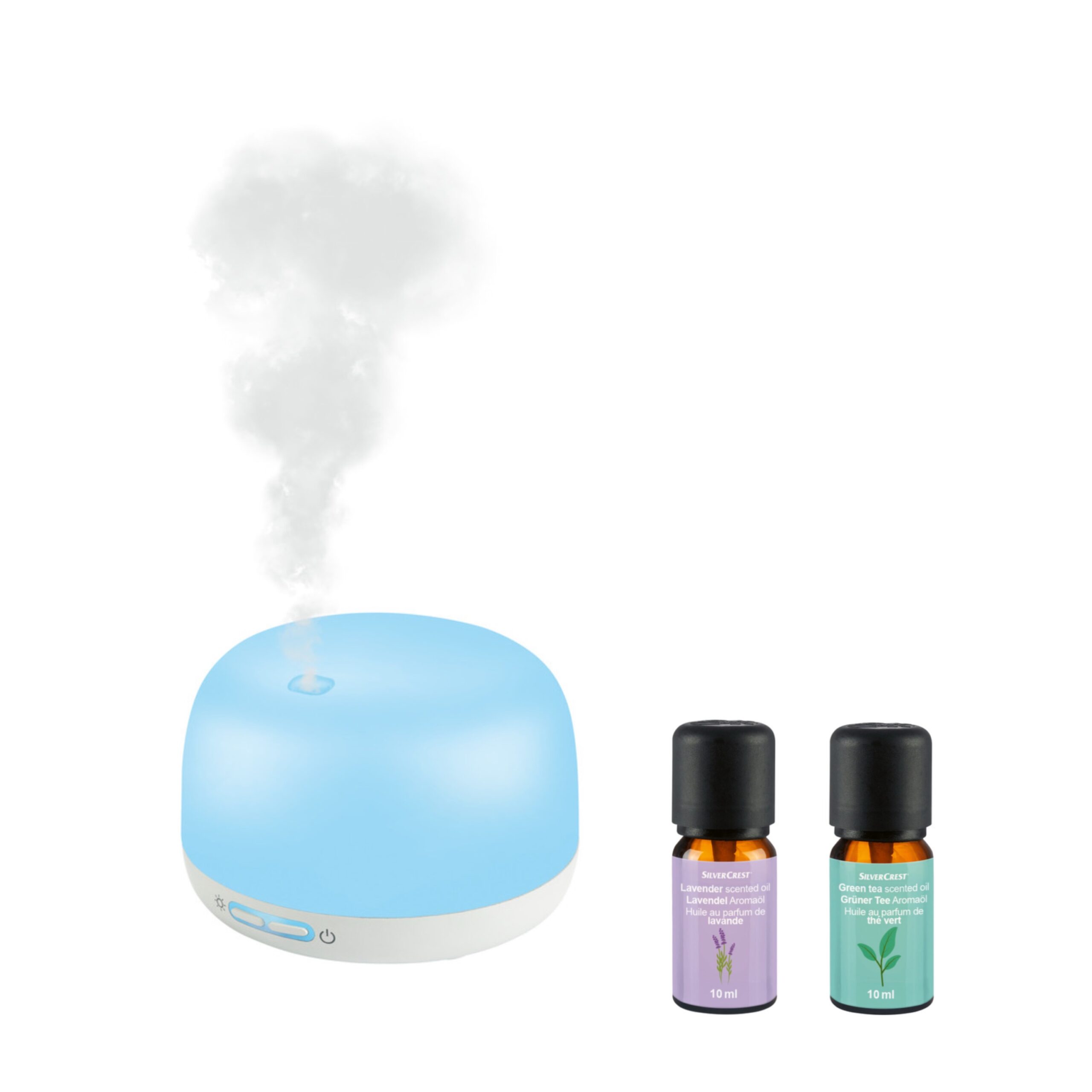 موزع روائح أنيق من SILVERCREST يعمل بالموجات فوق الصوتية، يمنحك أجواء عطرية مريحة مع إضاءة LED متغيرة، ويأتي مع عطرين مجاناً لتجربة استرخاء متكاملة في المنزل أو المكتب